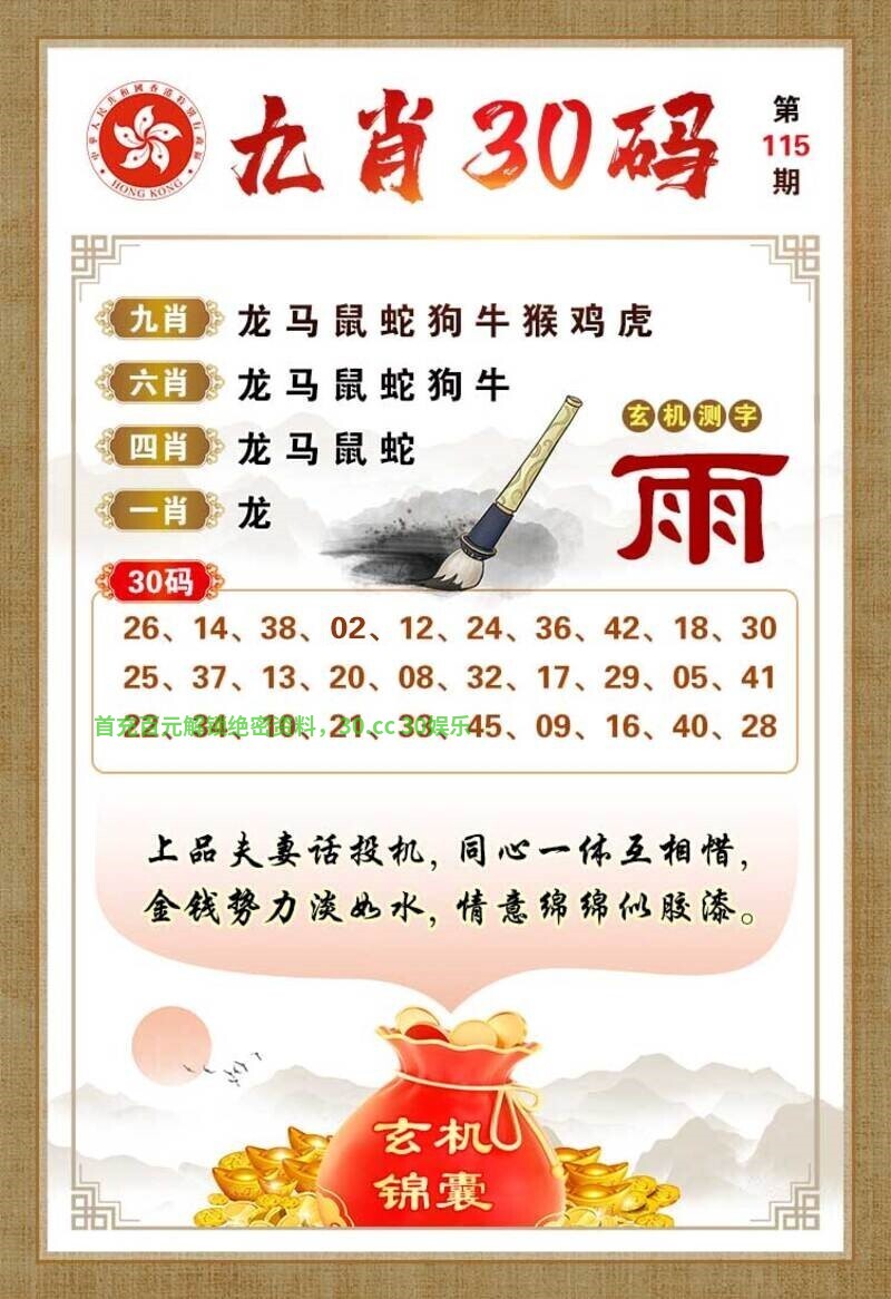 | 115期:九肖30码诗句。 上品夫妻话投机,同心一体互相惜,金钱势力淡如水,情意绵绵似胶漆。 解析:上品夫妻话投机,同心一体互相惜。解特:龙马鼠蛇狗牛猴鸡虎 综合生肖:龙马鼠蛇狗牛猴鸡虎  |